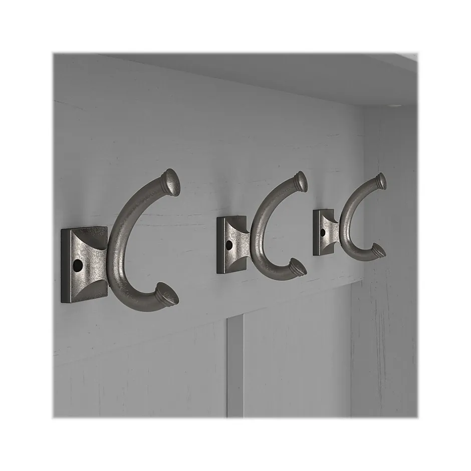 The Bush Furniture Woodland Entryway Storage Set with Hall Trees and Shoe Bench with Drawers combines transitional styling and a practical design to offer an ideal organization solution. Have a seat on the durable storage bench and take a moment to relax as you get ready to head out the door or come home after a long day. Each section of the long mudroom bench supports 250 pounds, so you can sit down to put on and take off your shoes with confidence. Vertical and cube shelving along with two small drawers to the left and right accommodate footwear and accessories for a clutter-free entryway, mudroom or foyer. The narrow hall trees include three coat hooks in the front and one on each side for hanging jackets, hats, and more. This entryway bench and coat rack set has been tested to meet Bush Furniture’s standards for safety, performance and durability and is backed by a 3 Year Warranty.