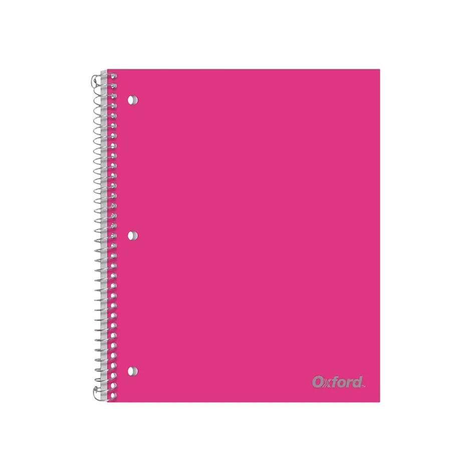 This Oxford one-subject poly notebook comes in bright colors with front pocket storage. The notebook is perforated, three-hole punched, and spiral-bound with a strong no-snag coil. Comes in assorted colors.