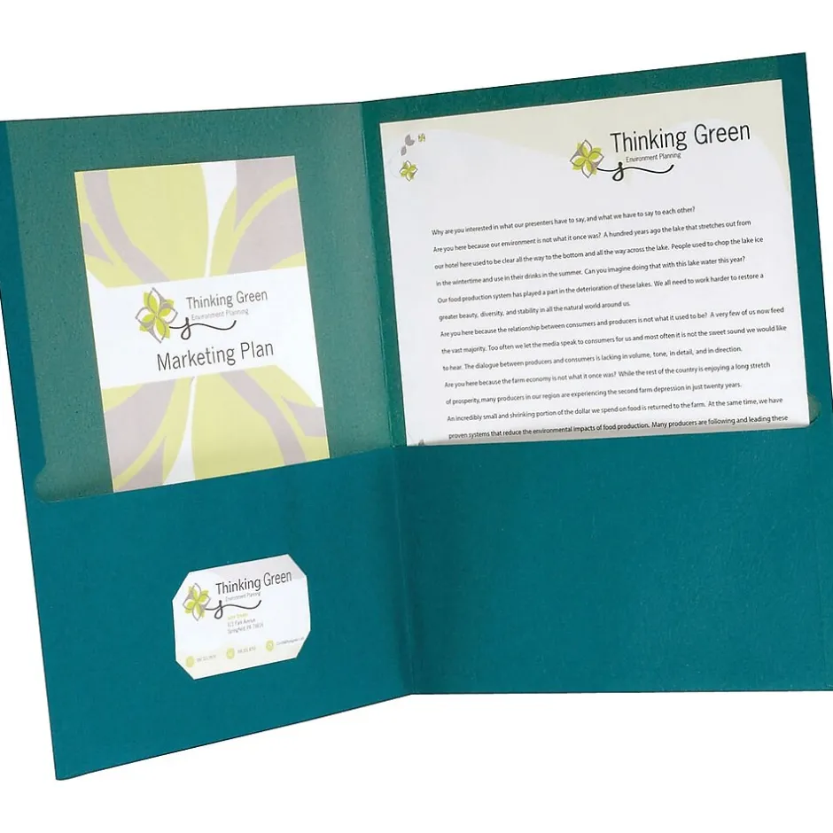 - Two-pocket folders also have a die cut for business cards