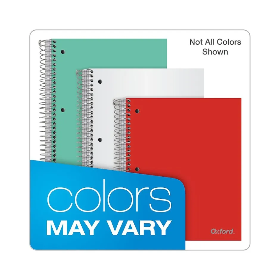 This Oxford three-subject poly notebook comes in bright colors and is three-hole punched to fit a standard binder. Includes three poly divider pockets and a strong no-snag coil. Comes in assorted colors.
