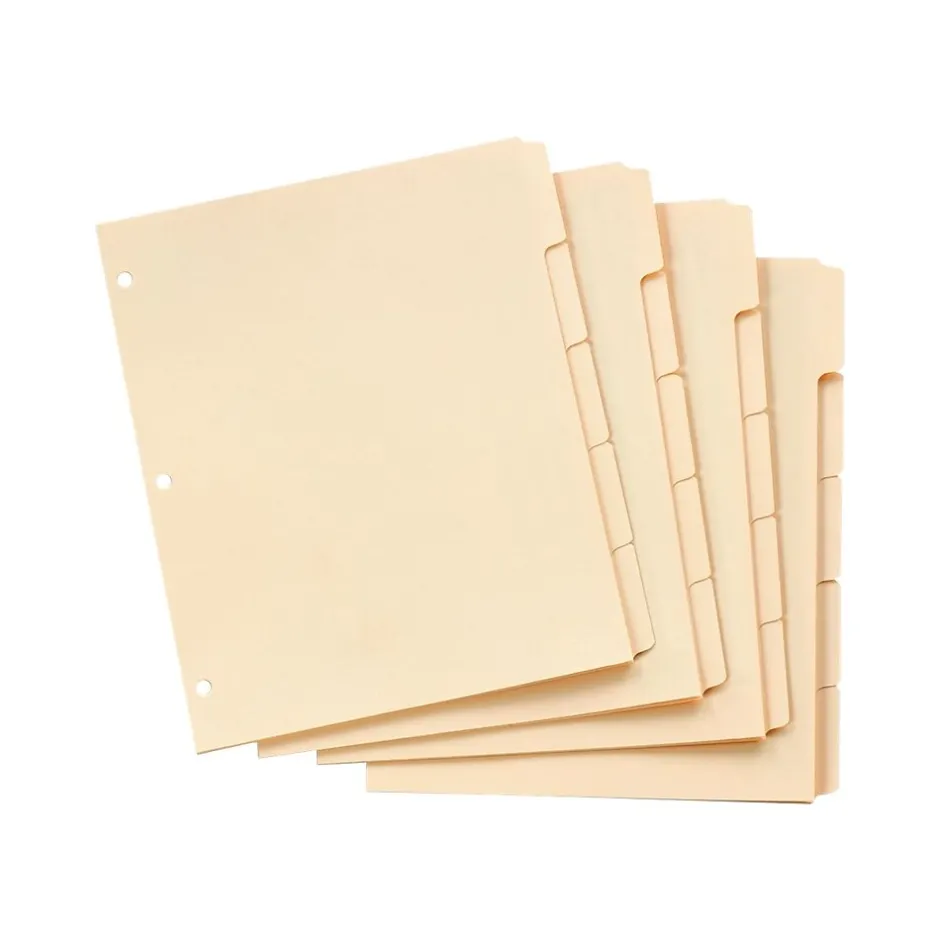 Organize reports, manuals, catalogs and other important documents with these write-on tab dividers. These sturdy manila sheets feature a blank fifth-cut tabs layout, providing a perfect option for adding handwritten or preprinted labels. Each of these dividers features prepunched edges for convenient compatibility with most three-ring binders. These Oxford tab dividers come in a box of 20 for handling multiple projects efficiently.
