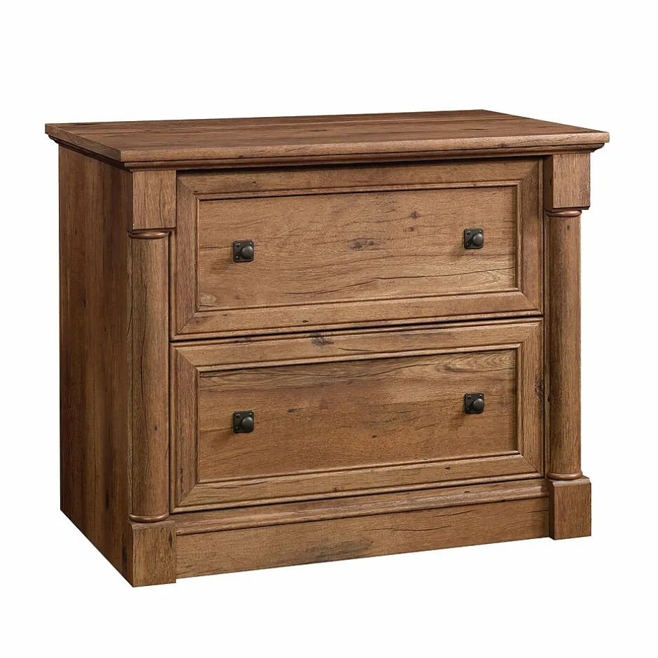 Elegant style and organizationthat is what you will get with this lateral file from the Palladia collection. This handsome file cabinet features two drawers that open and close on smooth full extension slides. Each drawer accommodates letter, legal or European size hanging files to keep you organized and clutter free. It features a patented, interlocking safety mechanism that allows only one drawer to open at a time for increased safety. Its spacious tabletop surface makes the perfect spot to display all your favorite thingsa stylish accent lamp, awards and achievements, decorative plants or any other home decor. Use it in your office, living room, or around the home as an accent pieceit looks good no matter where it stands! Finished in a beautiful Vintage Oak, this stunning lateral file gives your home the style you have been craving with the functionality you have needed.