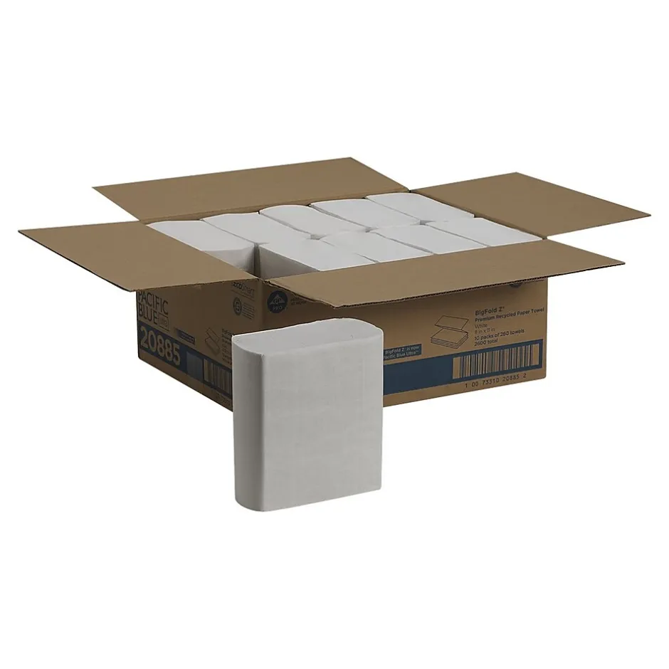 Stock restrooms, break rooms and other shared spaces with these multifold paper towels. The white color offers a crisp appearance, and the folded design fits neatly in compatible dispensers. Each towel features absorbent construction, making it simple to soak up spills, splashes and other messes. Each bundle comes conveniently wrapped for easy storage. These Pacific Blue Ultra Z-Fold one-ply paper towels come in a 2600-count case, providing an ample supply for busy offices, restaurants or other commercial locations.