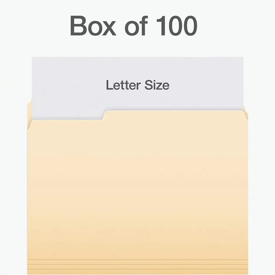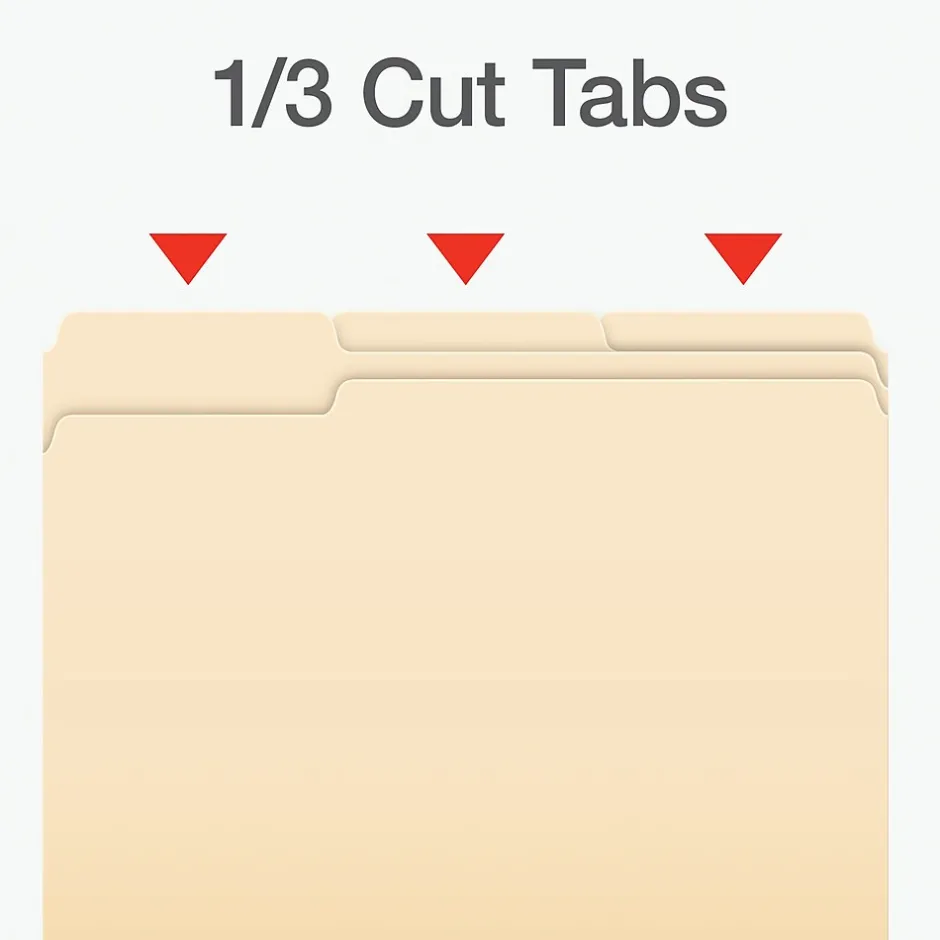 These Pendaflex File Folders are made from heavyweight 14 pt. paper to better withstand wear and tear. They come in a nice, neutral manila to match any home or office aesthetic. The 1/3 cut tabs come in 3 different positions (left, right, center), so you can see all of your labeled tabs in a file box or file drawer. Each folder fits letter-sized papers and is scored along the bottom for 3/4 inch expansion. Box of 100 manila file folders.
