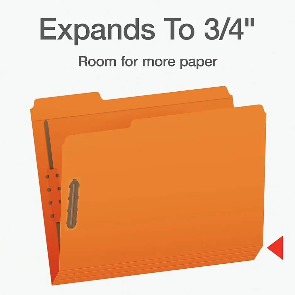 These Pendaflex Fastener Folders have thick, reinforced tabs that will better withstand wear and tear. Two embedded fasteners keep paperwork ordered and in place. The 1/3 cut tabs come in 3 different positions (left, right, center), so you can see all of your labeled tabs easily. Each folder fits letter-sized papers and is scored along the bottom for 3/4 inch expansion. Box of 50 orange fastener folders.
