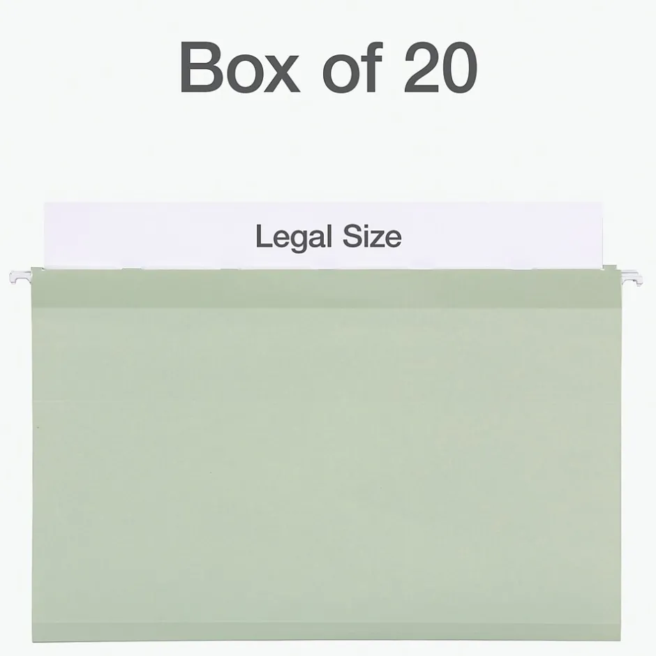 These Ready-Tab Reinforced Hanging File Folders have built-in tabs you can just lift and use. Poly strips at the top and bottom edges protect against rips and tears. They have large 1/6 cut tabs and include a printable sticker label sheet. You can also write on the tabs with a permanent marker. They fit larger, legal size 8.5″ x 14″ documents. Box of 20 sage green hanging file folders.
