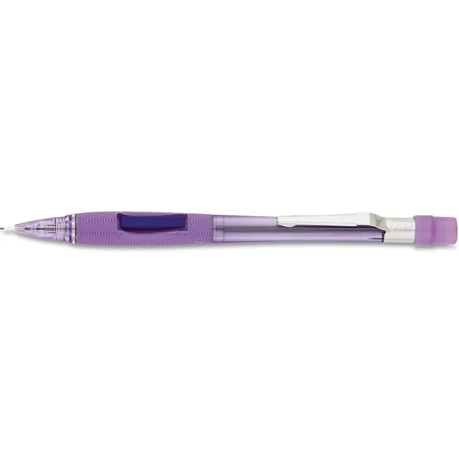 Violet 0.7mm mechanical pencil with convenient side button propels lead for continuous writing without changing hand position.