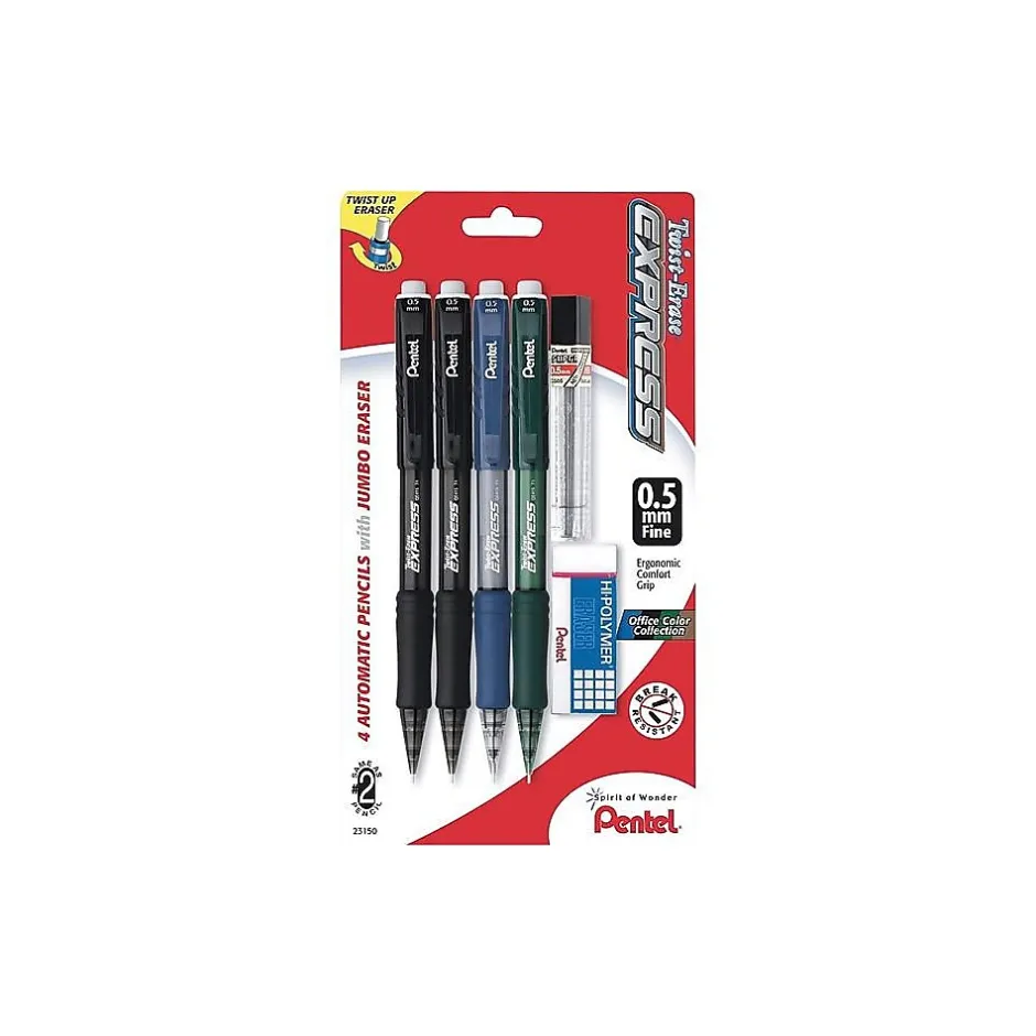 Write letters, journal entries, and notes with this starter set. With a durable rubber grip, this Pentel Twist-Erase Express 0.5mm starter set makes writing comfortable, and the twist eraser is extra long, offering longevity.