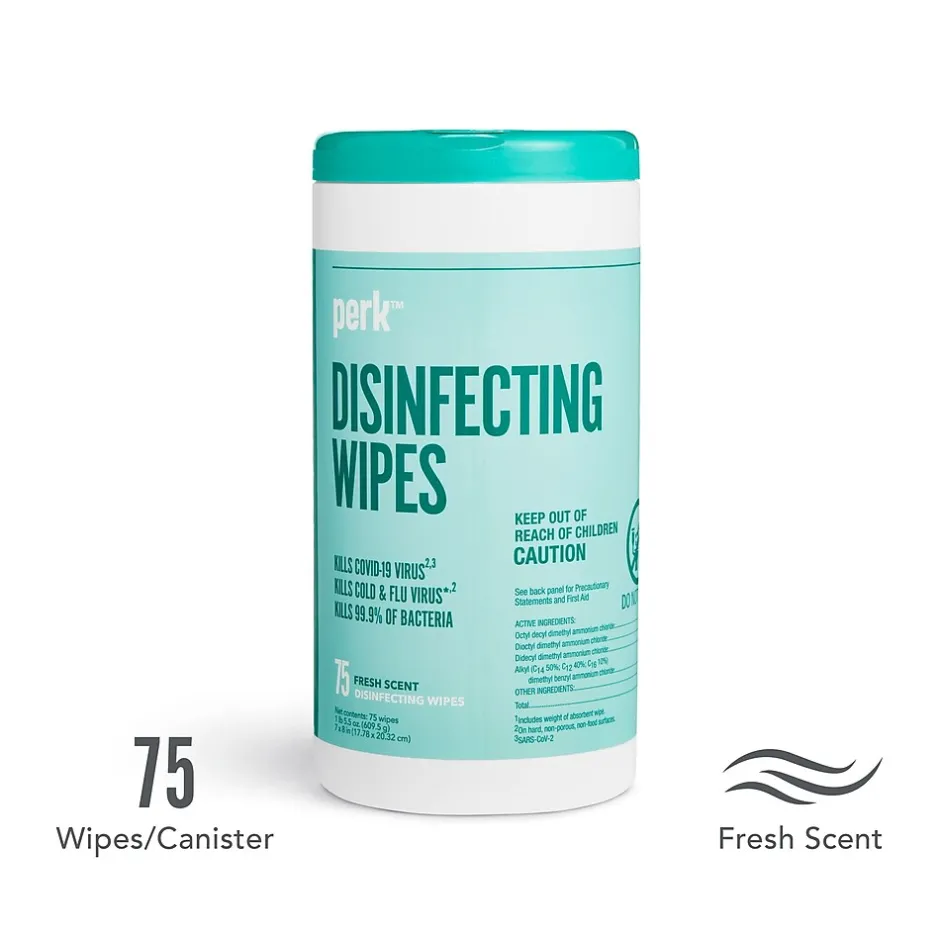 Clean and disinfect your workplace in one easy swipe with Fresh-scented Perk Disinfecting Wipes. These disinfecting wipes are proven to kill 99.9% of germs, including cold and flu viruses, E.Coli, Staph, Strep and Salmonella. Conveniently and safely take on every task from first sheet to last by cleaning, deodorizing, and disinfecting hard, nonporous, non-food-contact surfaces. These premoistened wipes remove germs and messes leaving behind a light lingering fragrance. They quickly clean and disinfect high-touch surfaces, such as doorknobs and faucets. Ideal for offices, classrooms, dorms, day care centers, hotels and other commercial facilities. This product will not harm most surfaces including acrylic, sealed fiberglass and vinyl. Sealed to prevent liquid loss, these Perk wipes easily stores away, staying moist and effective.