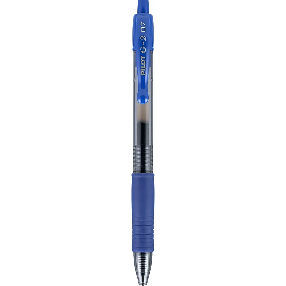 Enjoy clear, neat strokes with these premium retractable gel roller pens. Sold in a pack of 36 and with a convenient tub container, these pens make stocking up simple and can be stored away easily. These Pilot G2 fine-point blue pens feature a retractable design, so you can get started on writing tasks with a quick click and the ergonomic rubber-coated grip offers enhanced writing comfort.