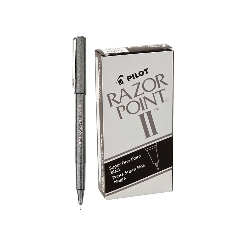 Keep pen supplies in your classroom or office full with this 12-pack of Pilot Razor Point II marker pens. The compact design and metal clip let you conveniently store them in a shirt pocket, while the stylish barrel provides a sleek, sophisticated appearance. These Pilot Razor Point II marker pens have a super-fine point to let you create incredible detail.