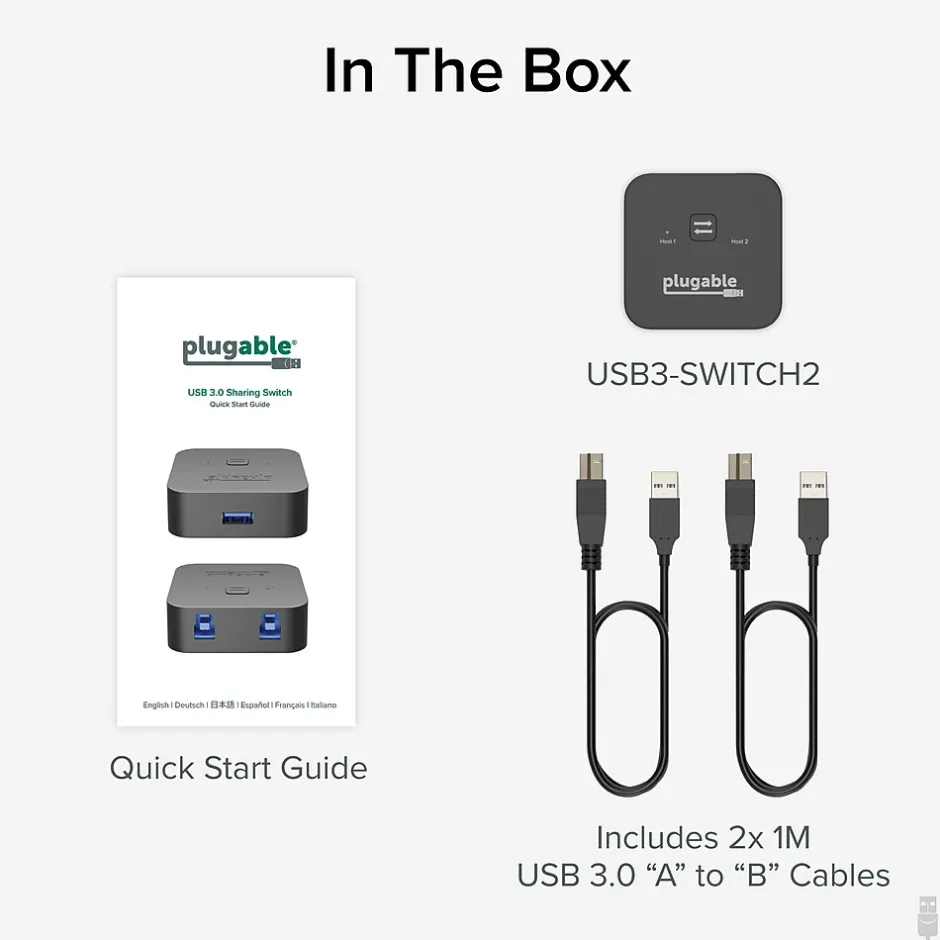 The Plugable USB3-Switch2 sharing switch saves your desk space with its slim design and offers maximum compatibility for all USB with plug and play convenience. This USB3-Switch2 is easy to install without any drivers and the shared devices are hot-swapped between computers by one button press. The two LED indicators make you to know which computer has the device right now. The 1 “A” port connects any USB 3.0, 2.0 or 1.1 device/hub and 2 “B” port connects the switch to two hosts.