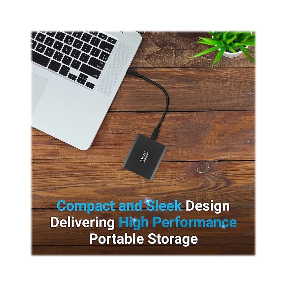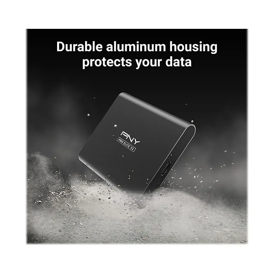 The PNY Pro Elite V2 portable SSD is the next generation in mobile storage, boasting not only increased storage capacity but also exceptional performance, with a USB 3.2 Gen 2 x 1 interface and read and write speeds up to 1100MB/s and 1000MB/s, respectively. This SSD is designed to be a mobile storage solution superior to previous generations of portable SSDs, as well as traditional USB 3.0 flash drives, allowing for even faster transfer and storage of files on the go. The Pro Elite V2 allows for expanded connectivity: access your data anytime, anywhere, from a vast array of host devices, both USB Type-A and USB Type-C enabled. The SSD comes with USB Type-C to USB Type-C and USB Type-C to USB Type-A cables, right in the box. What’s more, the included Acronis True Image data protection software easily backs up data. The Pro Elite V2 features a sleek aluminum design that fits comfortably in the palm of your hand, making it the perfect solution for life on the go.