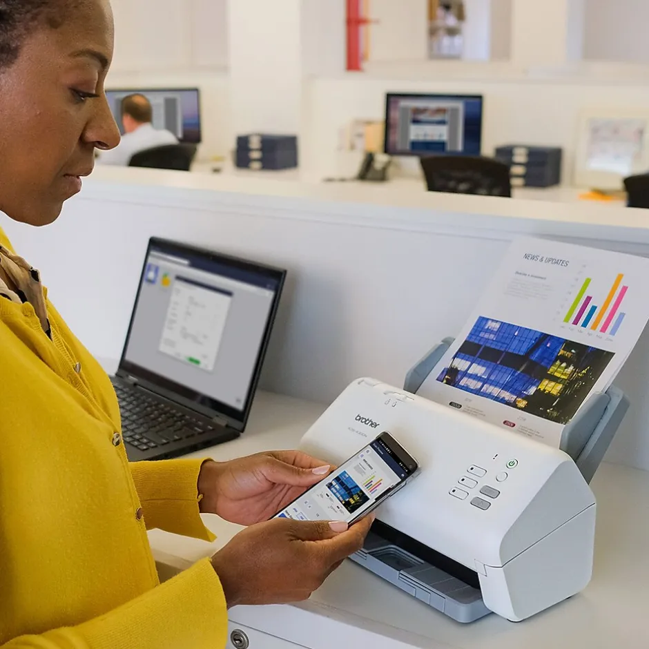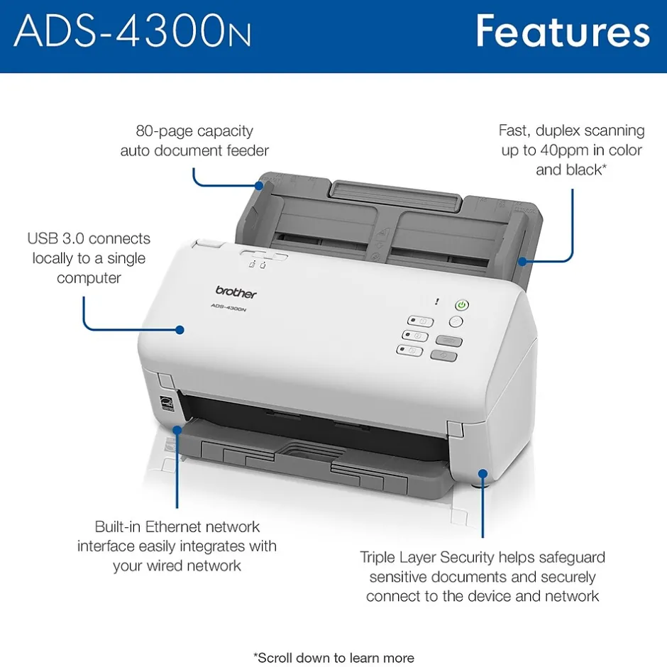 The Brother ADS-4300N professional desktop scanner with Ethernet connection is an essential component of an optimized fleet for the way work now works.