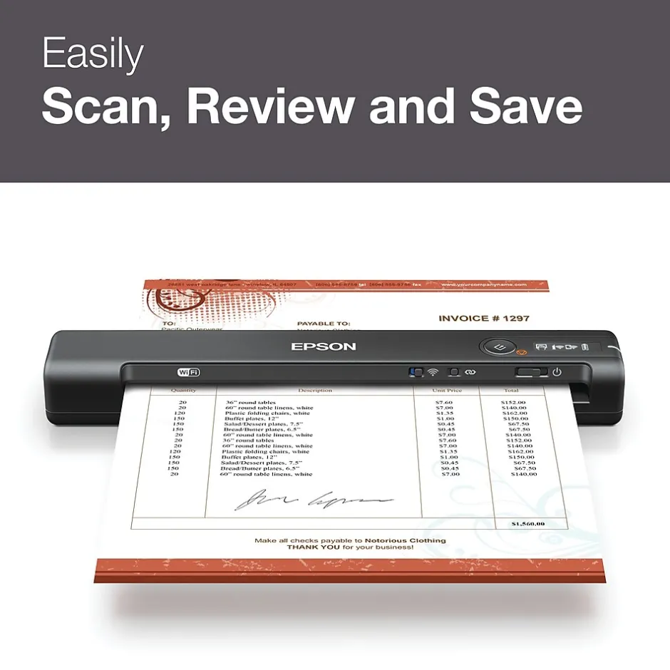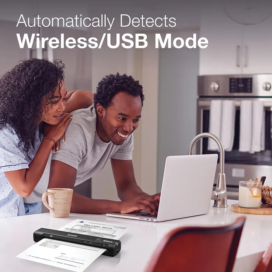 The fastest, smallest and lightest wireless mobile single-sheet-fed document scanner in its class, the WorkForce ES-60W features wireless scanning and groundbreaking speeds ― scanning a single page in as fast as 4 seconds. Wirelessly scan documents to a PC, Mac, iOS or Android device. The scanner features Nuance OCR to create searchable PDFs and editable Word and Excel files, plus Epson ScanSmart Software to easily scan, review and save. USB or battery-powered, the scanner automatically detects whether it’s in wireless or USB mode. No intervention is required. And, a convenient LCD displays the wireless status, as well as battery level.