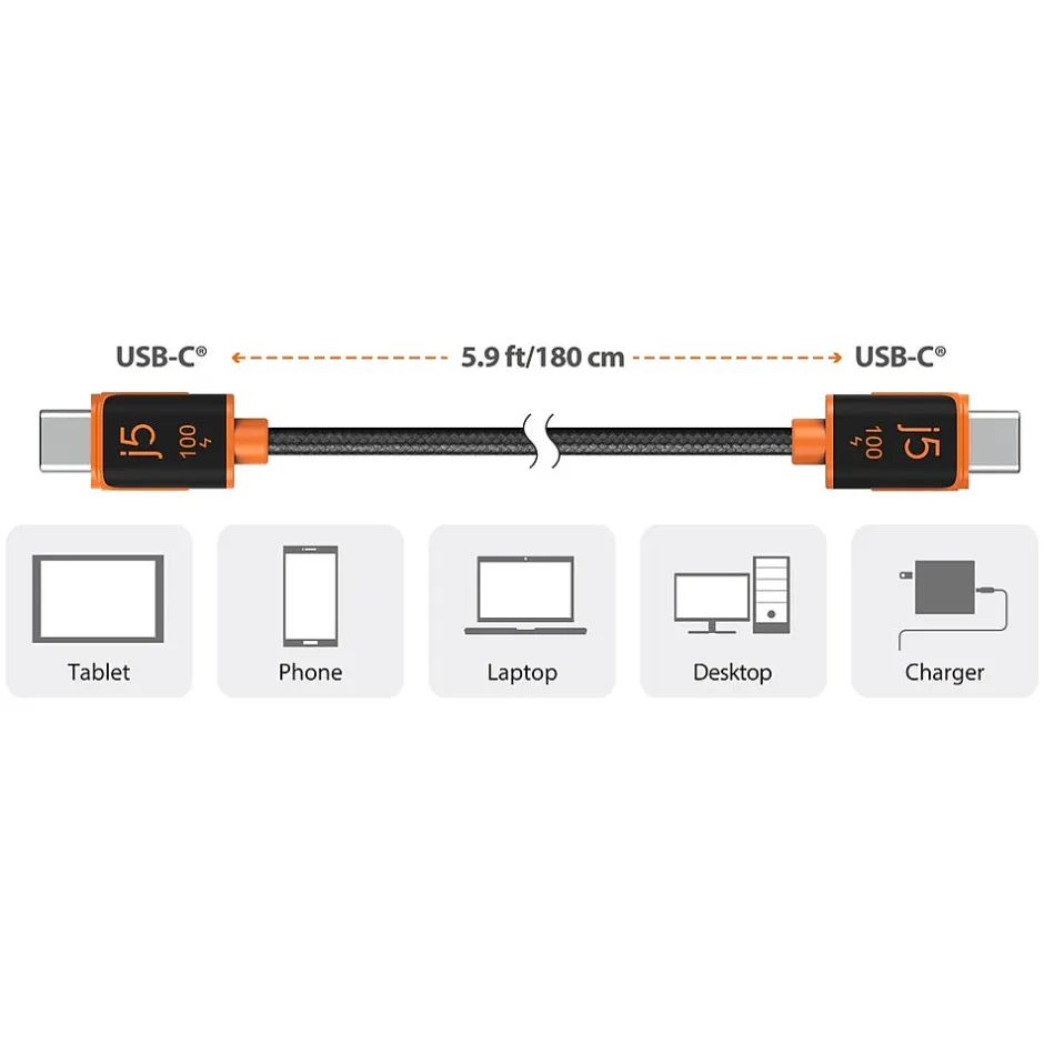 The j5create USB Type-C 100W synchronization and charging cable is a high-speed cable that is great for charging USB Type-C devices. The cable features a reversible USB Type-C connector on each side. The power cable supports Power Delivery and data transfer between smartphones, tablets, and laptops. It supports speeds up to 480Mbps and an output of 5A. With a double-braided polyester cover, the exterior is abrasion-resistant, reducing fraying and increasing the life span.