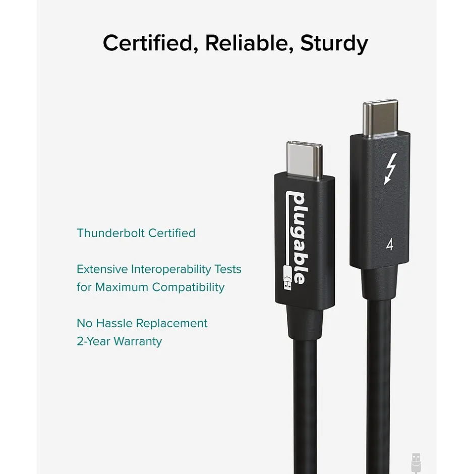 The Plugable Active 1M (3.2ft) Thunderbolt 4 and USB 4 cable is built to deliver a true Thunderbolt experience. Even at a full meter, get 100W Power Delivery, 40Gbps data transfer speeds, and support for two 4K screens or one 8K screen with no loss in performance. And because it’s certified Thunderbolt 4, it can be used as a Thunderbolt 3 cable in your Thunderbolt 3 dock-and that’s true for USB-C and USB4, too. Thunderbolt 4 or USB4, which is it? Both. And a little more. This cable is Thunderbolt 4 certified, and that comes with some incredible benefits. USB-C, USB4, Thunderbolt 3, or Thunderbolt 4, it doesn’t matter, The Plugable Active 1M USB4 and Thunderbolt 4 cable will work. Even at a full meter, you won’t see a decrease in performance. Often overlooked, the cables connecting our computers to their peripherals have an important part to play. That’s why our and TBT4-40G1M cables are Thunderbolt certified-it’s the only way to ensure you’re getting complete compatibility and reliability. That means data transfer speeds up to 40Gbps, 100W 20V/5A Power Delivery, and backward compatibility with previous generations of Thunderbolt and USB. You have a powerful laptop. You have a high-definition monitor. Don’t sacrifice your resolution to cheap Thunderbolt cables. Plugable’s 1M Active Thunderbolt 4 and USB 4 cables deliver 33 million picture-perfect pixels, either split between two 4K monitors @60Hz, or all on one 8K screen @30Hz.