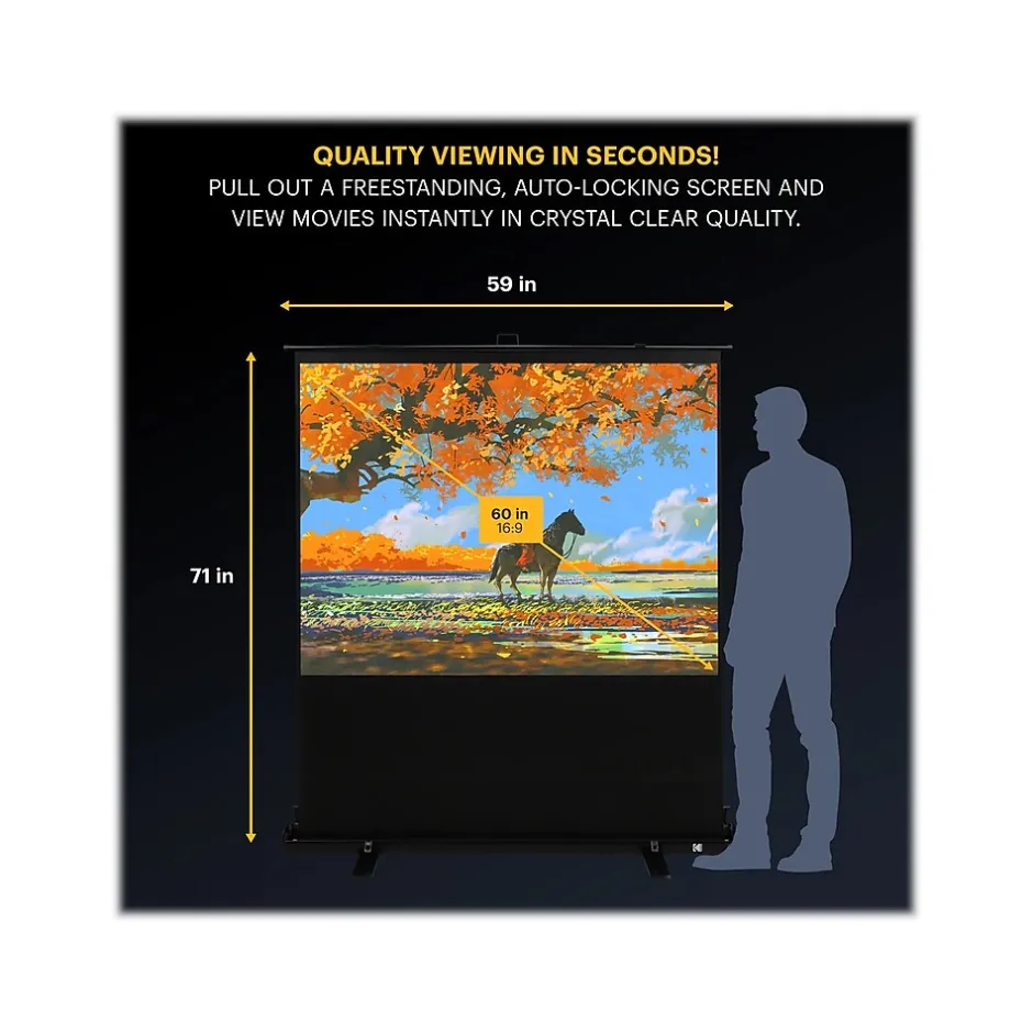 - Simply pull in an upwards motion, and the frame’s auto mechanism swiftly locks the screen into place: wrinkle-, rip-, and stress-free