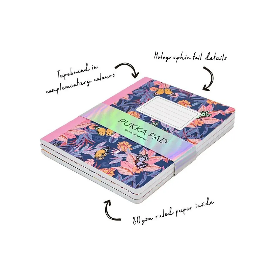 - Three notebooks in assorted designs per pack