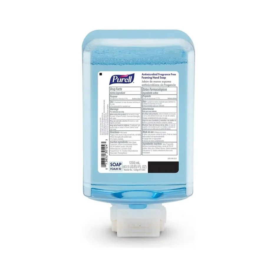 - Includes: 2 – PURELL® Antimicrobial Foaming Hand Soap, Fragrance-Free, 1200 mL Refills for the ES10 Automatic Hand Soap Dispenser. ES10 dispensers (8334-E1, 8330-E1, 8338-E1) are sold separately.