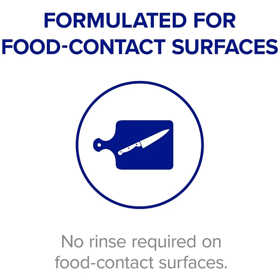 - There are no precautionary statements and no harsh chemicals, so gloves, handwashing, and rinsing are not needed – even on food-contact surfaces