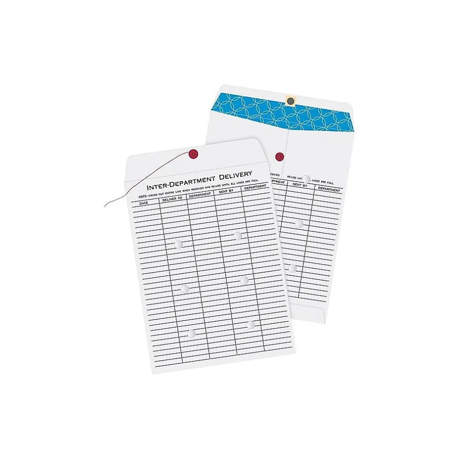 Keep track of reports, contracts, and other documents shared throughout your office with these interdepartmental envelopes. Preprinted forms offer space for names, dates, and departments, while the string-and-button closures keep papers securely tucked inside. With durable construction, these Quality Park interdepartmental envelopes stand up to repeated use.