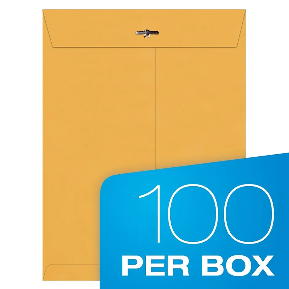 Use these brown gummed clasp envelopes to keep mail safe while in storage or transit. The sturdy metal clasp holds contents securely inside and lets you reuse these envelopes. The moisture activated seal with deep gumming on the flap creates a permanent seal when needed. These 9 x 12-inch envelopes come with 100 units per box and are constructed with 28-pound kraft stock to protect against rips, tears, punctures, and moisture.