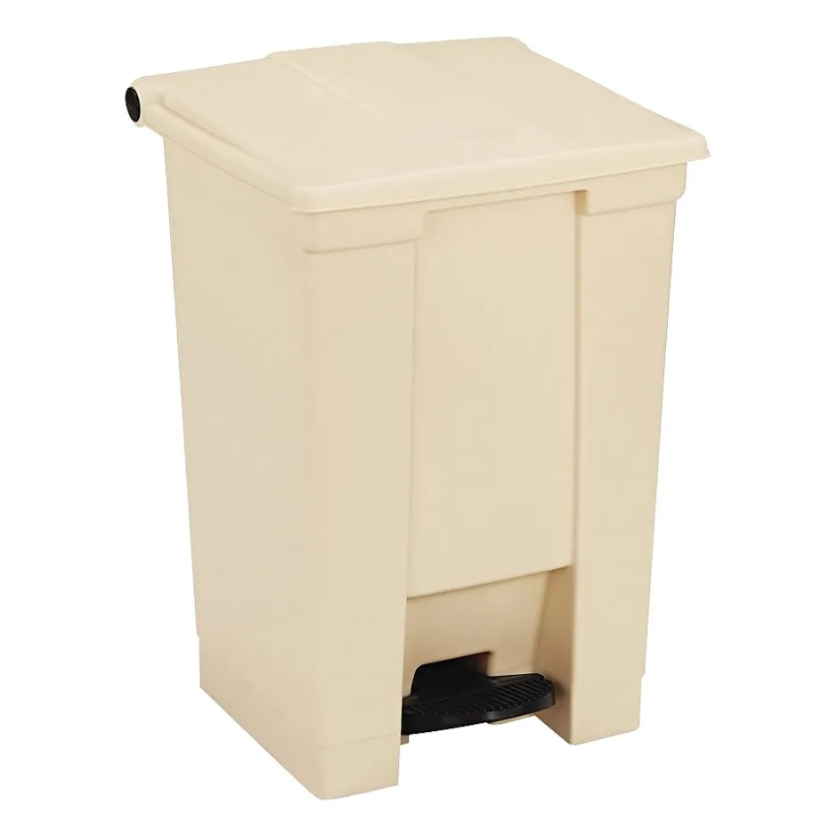 Rubbermaid Fire-Safe step-on receptacles have safety features to help keep your workplace safe. Convenience is built into this container, with its step-on design providing sanitary disposal of waste and refuse materials. The beige container holds up to 18 gallons of waste, so you need to empty it less often than smaller cans. A tight-fitting lid helps prevent odors from escaping while full. Made of sturdy plastic for long-lasting service, this receptacle works well inside or outdoors.