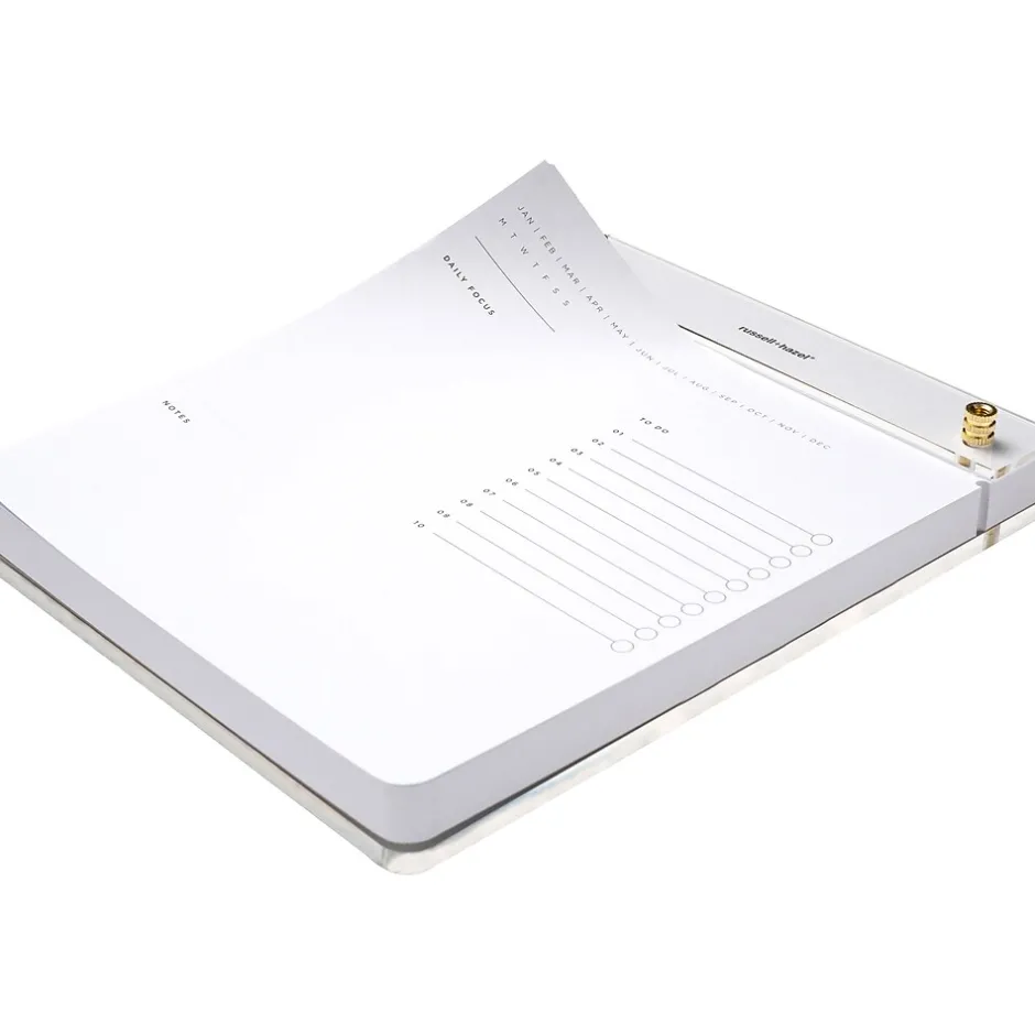 A new twist on this classic office accessory now with luxe gold detailing and acrylic backer. The Russell+Hazel acrylic drafter’s tablet features the iconic gold-toned hardware with a micro-perforated list paper pad. The 6.38″ x 8.44″ size of this notepad makes it the perfect desktop accessory to help you create and manage your daily to-dos. The paper pad is removable and held perfectly in place with delicate gold screws and it is refillable with the drafters tablet refills. Perfect for daily to-do lists, note taking, and planning.