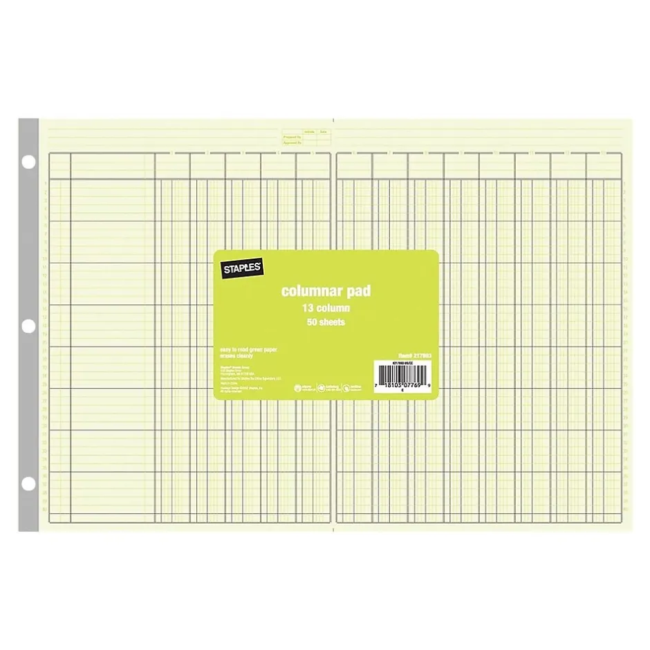 Create accounting records and documents with this 13-column columnar pad. Each sheet has 40 numbered cross lines to provide ample space for keeping detailed records, while the three prepunched holes on the edge let you store it in a three-ring binder for convenience. This Staples columnar pad is made with acid-free archival-safe paper, making it ideal for long-term record keeping.