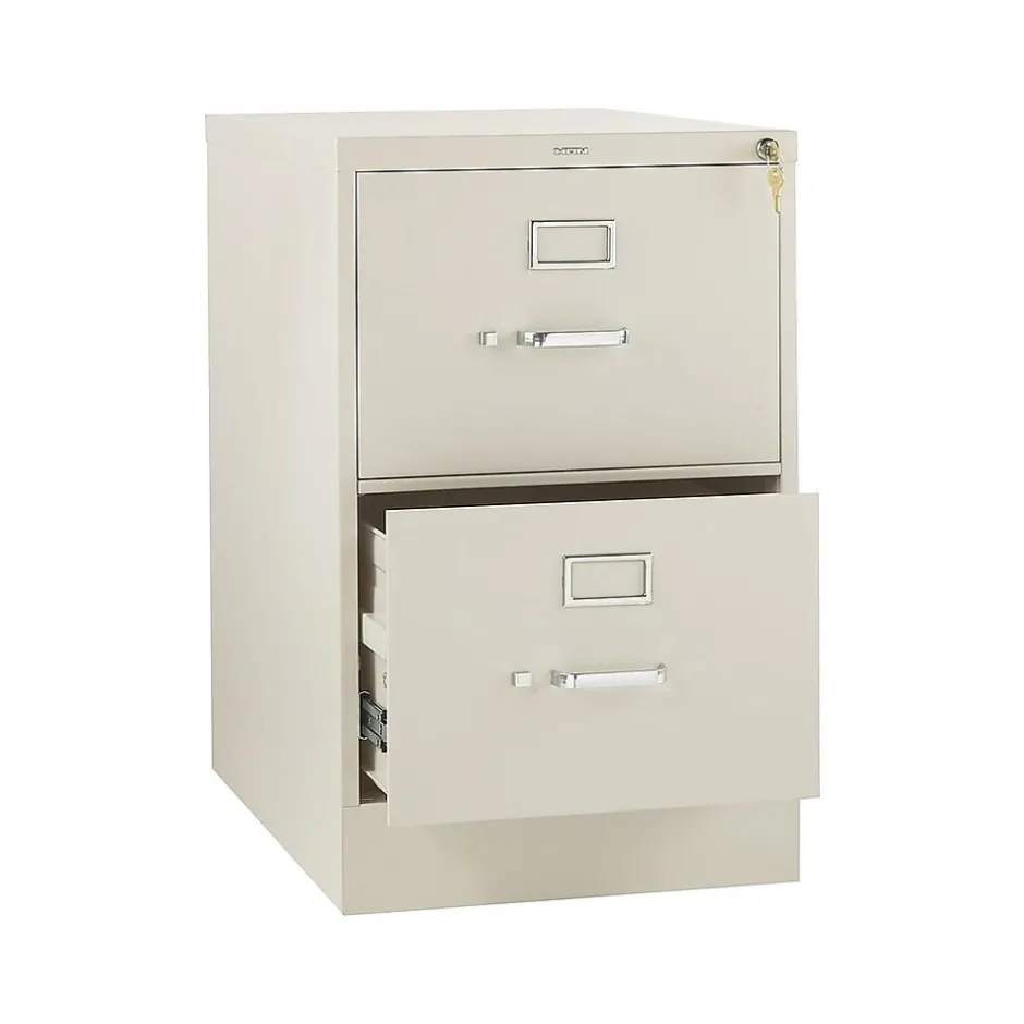 - Two-drawer vertical filing cabinet holds legal-size documents