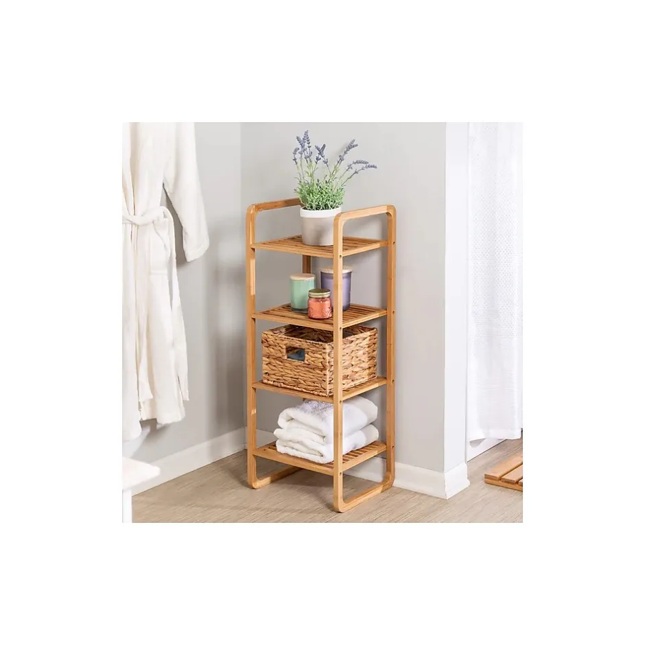 Honey-Can-Do 4-Tier Vertical Bamboo Shelf, Bamboo. Constructed of durable bamboo, this four-tier shelf offers storage and style. Measuring 14.625″ x 11.81″ x 36.42″, it offers plenty of vertical storage space with room under the bottom shelf for shoes or other shorter items. Bamboo is moisture resistant, making this shelf the perfect accessory for any bathroom. Shelf assembles easily and all assembly tools are included.