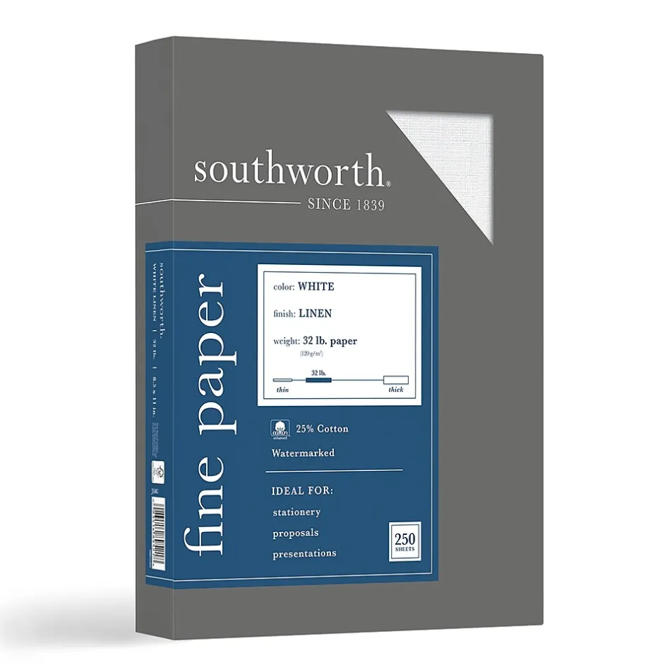 Give your printouts a classic, professional look with this linen-finish business paper. The 32-pound paper weight gives each page a substantial feel, while the white color creates a neutral background for text and graphics. Watermarks and date coding bring an official finishing touch to contracts and legal documents. This Southworth business paper comes in letter-size sheets, making it easy to load in standard printer trays.
