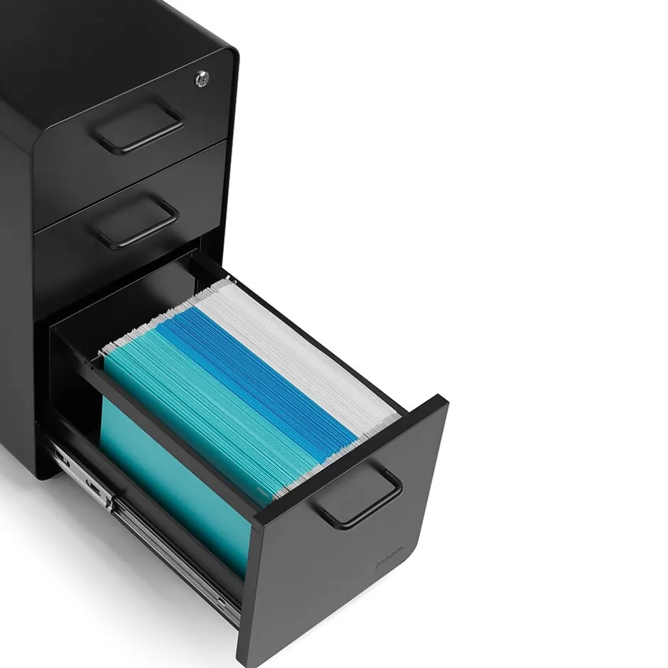- Slim Stow File Cabinet with durable powder-coated steel construction stands up to movers and shakers