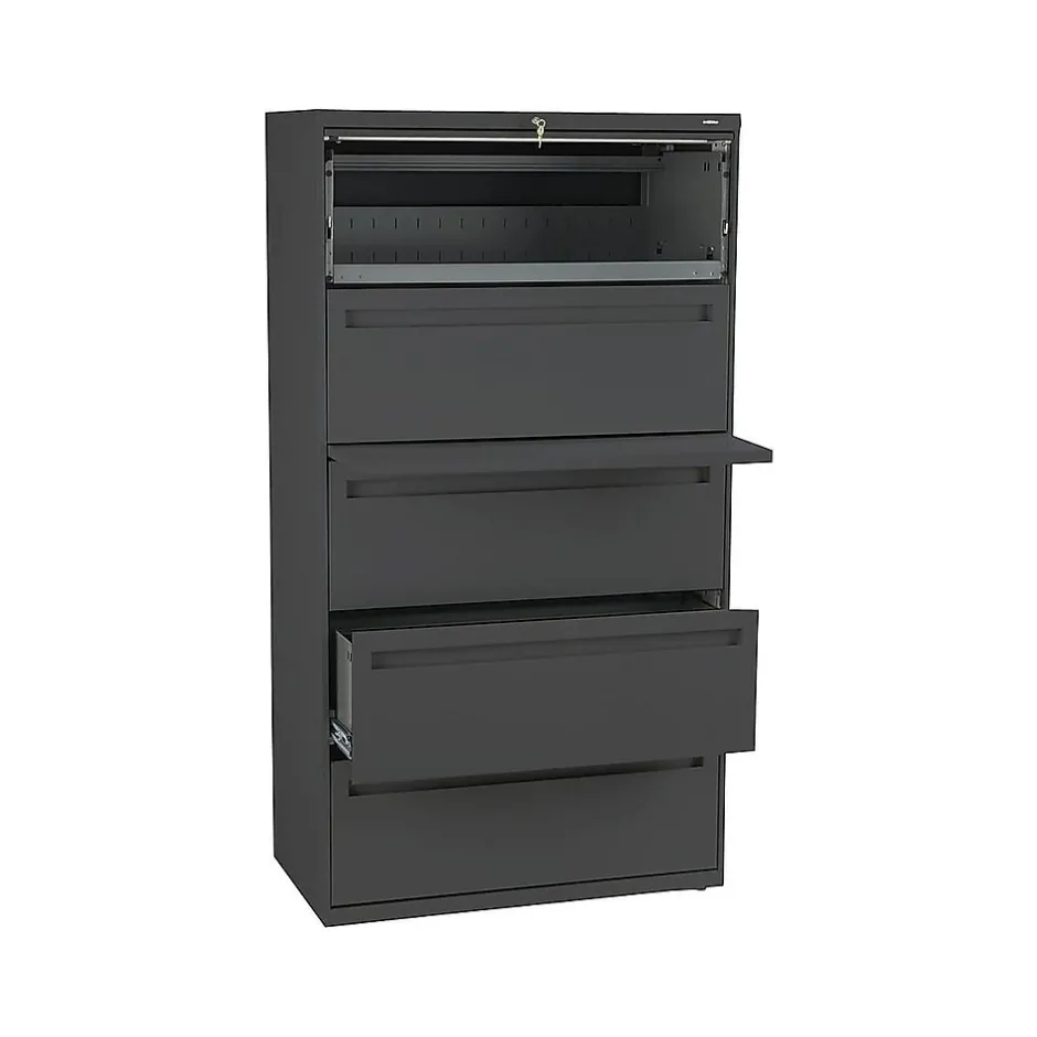 Devise a more sophisticated filing system with this HON Brigade 700 Series lateral file cabinet. Heavy-duty steel ball-bearing drawer suspensions keep each of the five drawers operating smoothly and quietly, while full-width recessed handles allow for easy opening. The removable lock core keeps files secure and lets you change out the locks whenever your office experiences turnover. This HON Brigade 700 Series lateral file cabinet offers a simple, low-profile look that blends perfectly with an array of office decor themes.