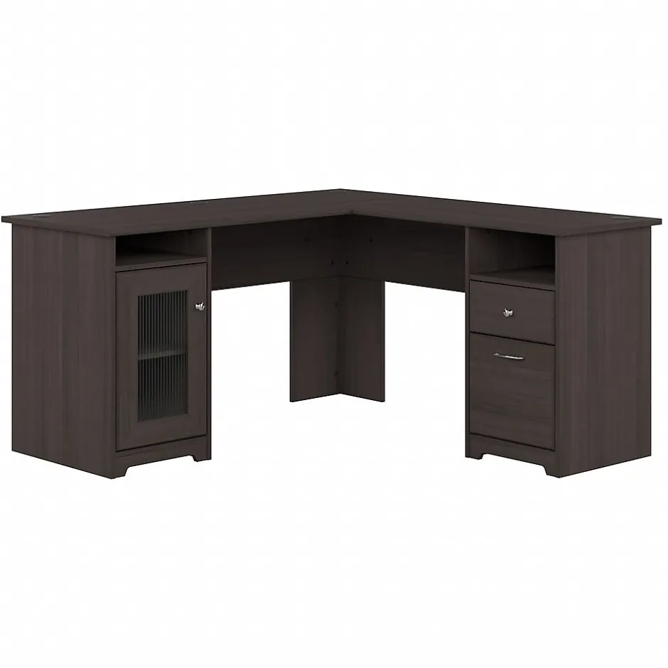 The Bush Furniture Cabot 60W L Shaped Computer Desk with Storage presents a home office solution with transitional style. Take advantage of the spacious L Shaped Desk surface to spread out with the materials you need to power through your next project or assignment. The durable desktop supports up to 200 pounds and has built-in wire management to keep cords and cables out of the way while you work. Organize materials inside a storage cabinet with one adjustable shelf behind a fluted glass door. The file drawer opens on smooth full-extension ball bearing slides for an effortless reach to letter, legal, and A4-size paperwork. A box drawer and two open cubby spaces are ideal for work-in-progress and frequently used items. This corner desk with drawers and storage has been rigorously tested to meet or exceed ANSI/SOHO standards for safety and performance and is backed by a 1 Year Warranty.