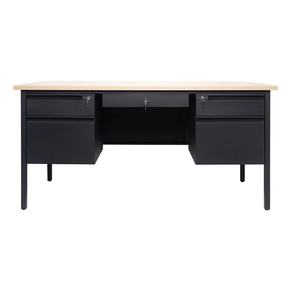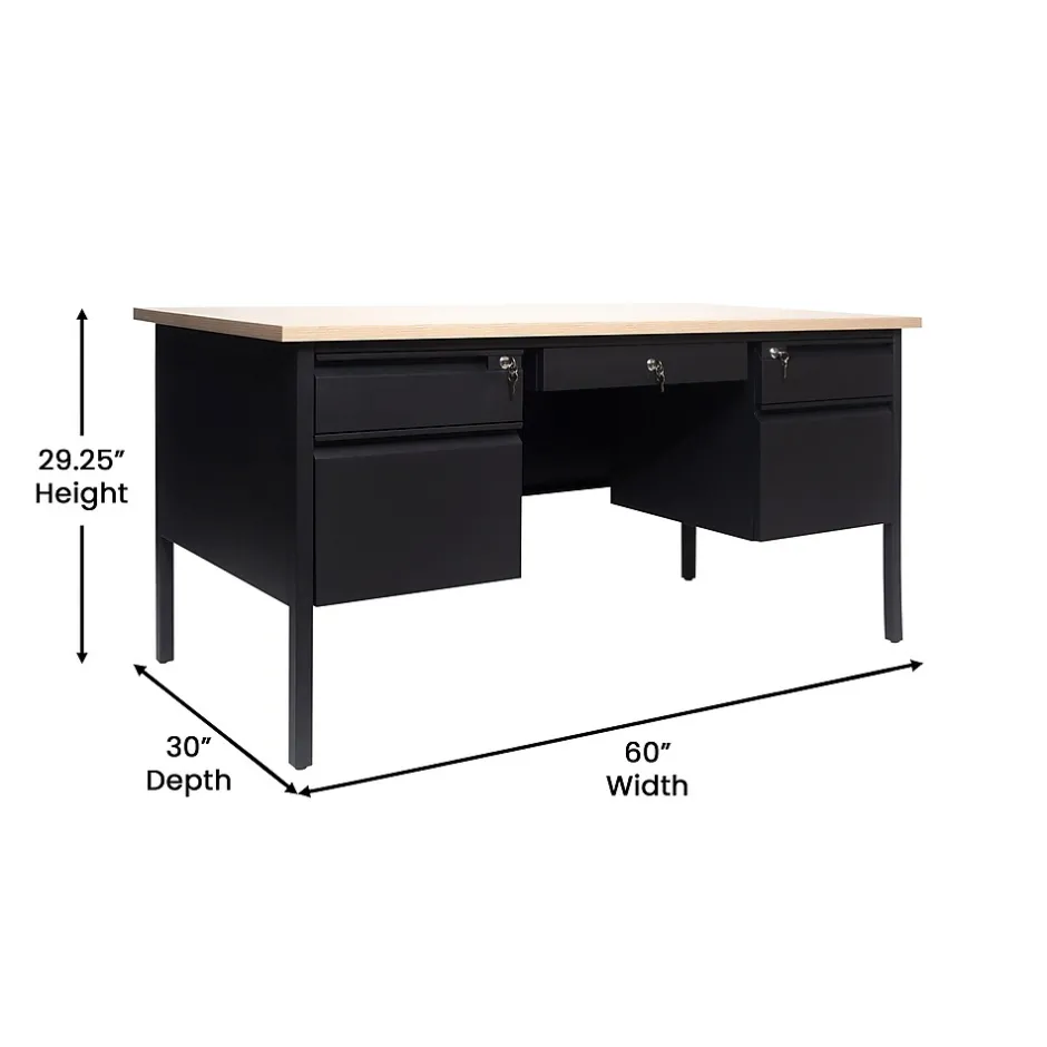 Give teachers and office workers alike a dedicated space for their tasks that is both functional and professional with this commercial grade double pedestal desk. Featuring a 1″ thick long-lasting laminate top, steel frame, and 5 locking drawers with ball bearing drawer slides, this multipurpose desk will stand up to the rigors of daily use. The premium materials allow this metal and wood desk to hold up to 300 lbs. static weight while the self-leveling floor glides ensure a level work surface. Assembly takes 30 minutes or less and a damp cloth is all that is needed to maintain the appearance of this must-have work space.