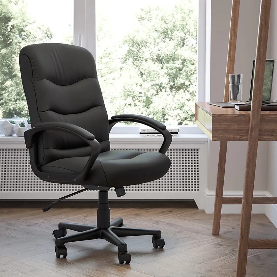 Upgrade your office seating with this mid-back black LeatherSoft upholstered swivel task office chair. A mid-back office chair offers support to the mid-to-upper back region. Chair easily swivels 360 degrees to get the maximum use of your workspace without strain. LeatherSoft is leather and polyurethane for softness and durability. The tilt lock mechanism rocks/tilts the chair and locks in an upright position while the tilt tension adjustment knob adjusts the chair’s backward tilt resistance. The pneumatic adjustment lever will allow you to easily adjust the seat to your desired height. This computer chair is perfect for the office or in the home. From behind the desk to the meeting room this chair can provide a seamless addition to your work space.