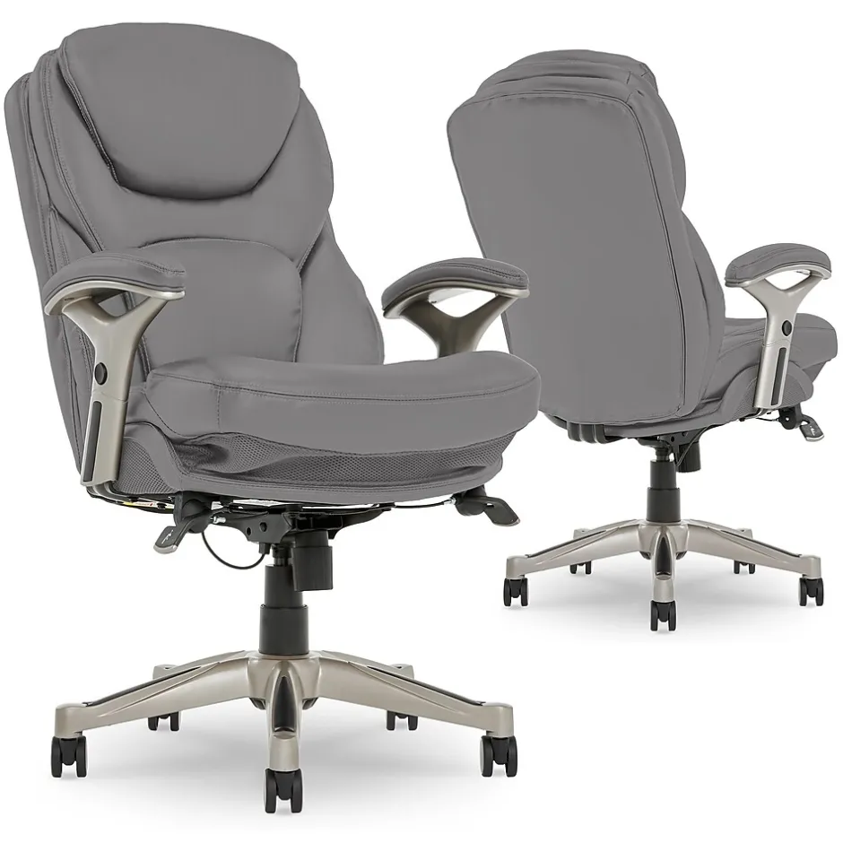 Help promote strength and flexibility in your back while you work with the Serta Back in Motion Executive Office Chair. This ergonomic office chair helps users become more productive and efficient by maximizing lower back support and comfort while seated. Its unique Back in Motion Active Seat Technology swivels the lumbar forward, providing the same effects as a pelvic tilt exercise by promoting spinal movement and flexibility in your core. Push-button adjustable armrests and pneumatic height adjustment allow the leather office chair to be quickly and easily customized to find the right fit for you. The multilayered cushions are soft yet supportive, so you’ll feel refreshed even after a long day.