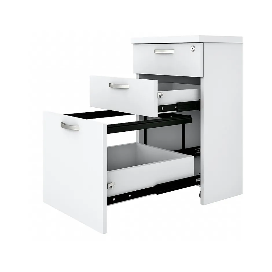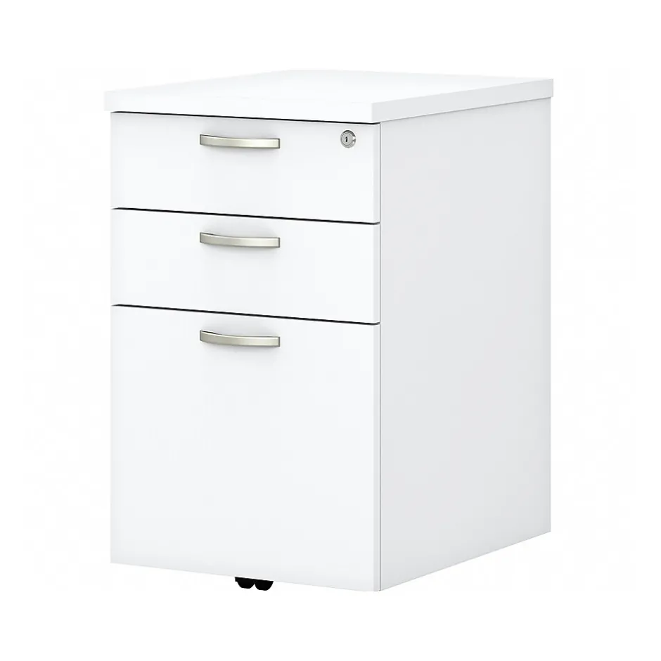 The Bush Business Furniture Easy Office three-drawer mobile file cabinet offers a perfect solution for adding storage to any professional workplace. With its dual-wheel casters and finished back, the portable file cabinet provides convenient access to paperwork and supplies anywhere in your office. The single file drawer organizes letter-, legal-, and A4-size documents while two box drawers store writing utensils, notepads, and more. The drawers open on smooth full-extension ball-bearing slides for an effortless reach to contents, and the top drawer can be locked to secure valuable items. A compact design allows the small file cabinet to fit underneath coordinating Easy Office cubicle desks (sold separately) for a space-saving configuration. This locking file cabinet is tested to meet ANSI/BIFMA standards for safety and performance and is backed by a 10-year manufacturer warranty.