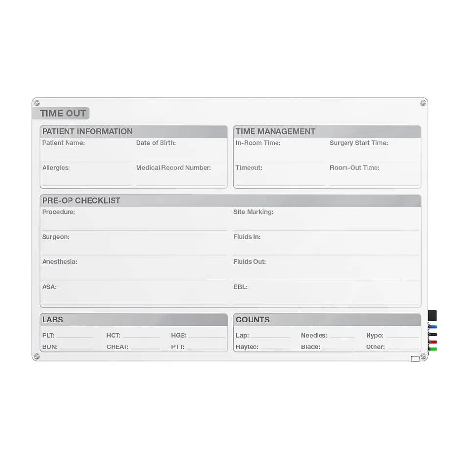 Ghent’s graphic glassboards are visually enhanced to encourage communication and collaboration. Ghent’s Time Out dry erase glassboards can be used anywhere in your hospital. The graphics on our erasable boards improve communication and reduce anxiety for patients and employees. The entire surface easily wipes off with a soft cloth, disinfectant wipe, alcohol or water. Ghent’s graphic glassboards are resistant to bacteria and germs, which helps with infection prevention. Our Harmony glassboard features a hideaway marker storage to keep the board clutter-free. Graphics are produced in gray to seamlessly match any interior and will never stain, ghost or fade.