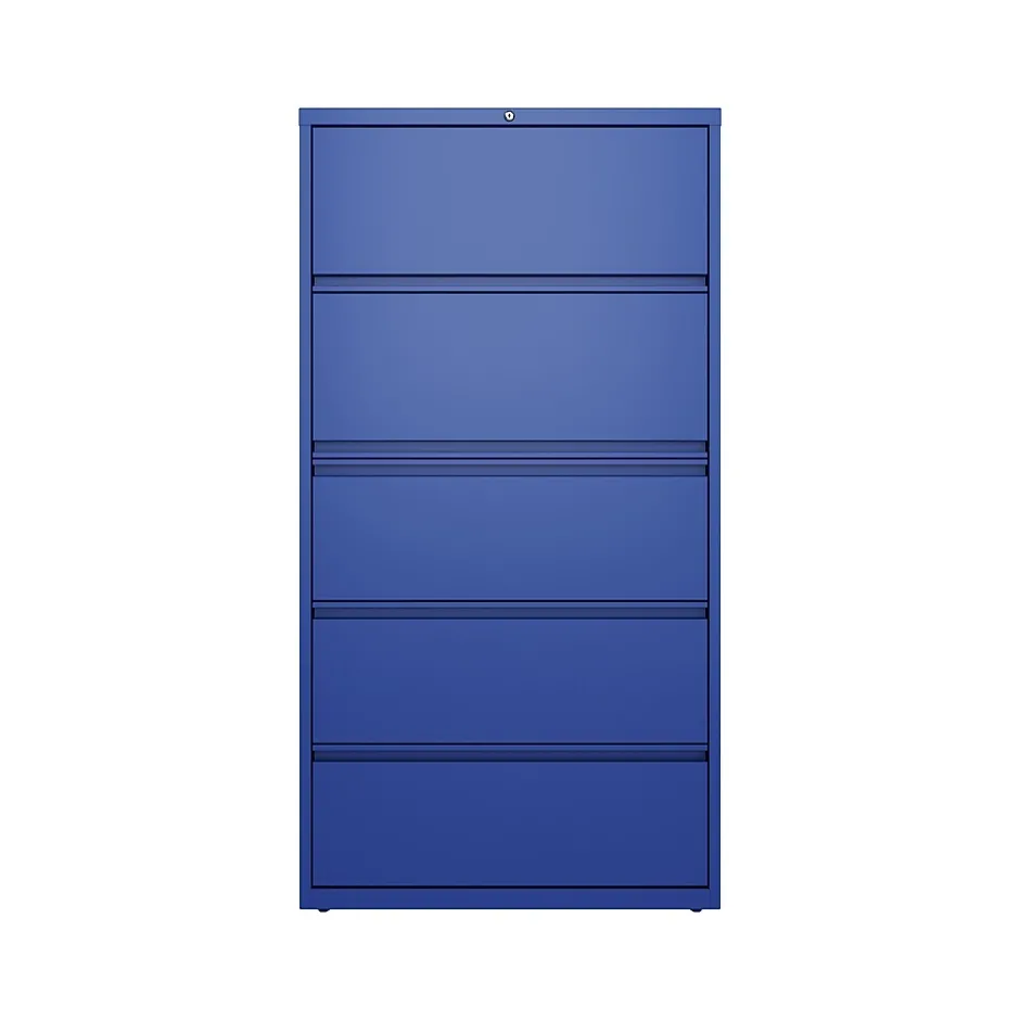 - Five-drawer lateral file cabinet holds letter-, legal-, or A4-size documents