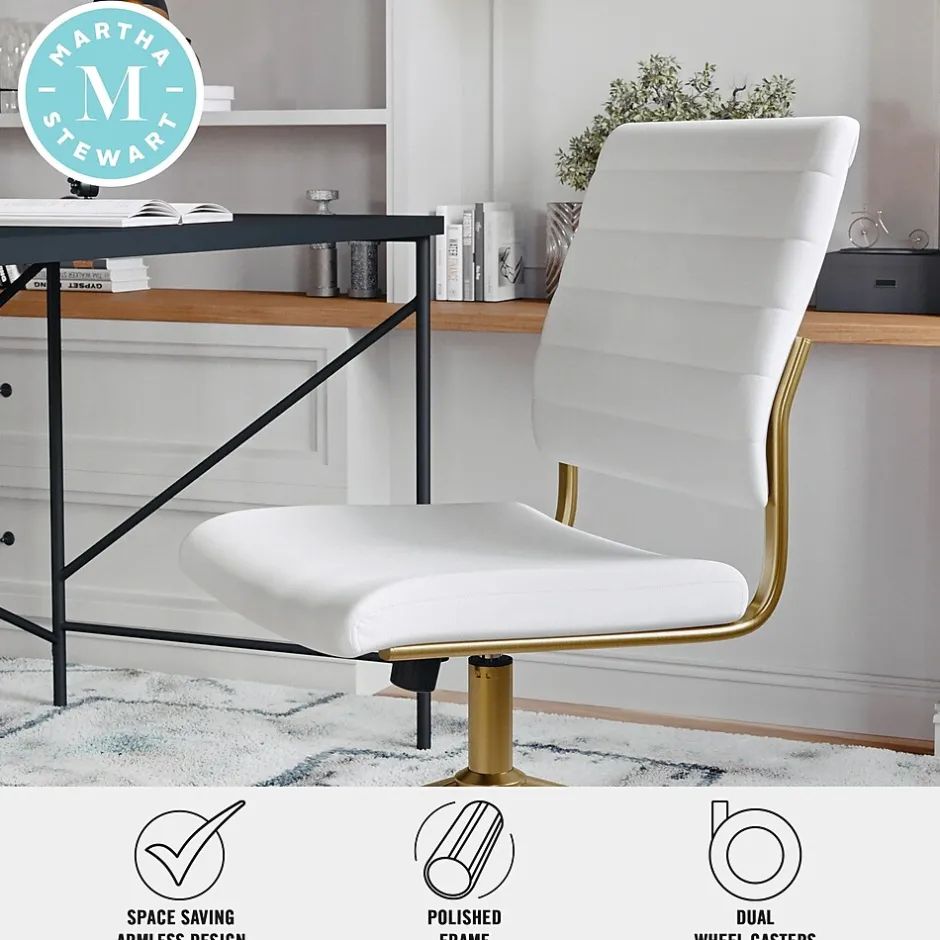 The Martha Stewart Ivy Armless Office Chair pairs traditional design with clean lines to instantly update your work space. This faux leather desk chair features a polished brass frame that adds elevated sophistication to a classic look. A pneumatic height adjustment lever tucked beneath the 360° swivel seat offers a custom seating experience to keep you comfortable throughout your workday. Assembly is easy with the included tools and step-by-step instructions.