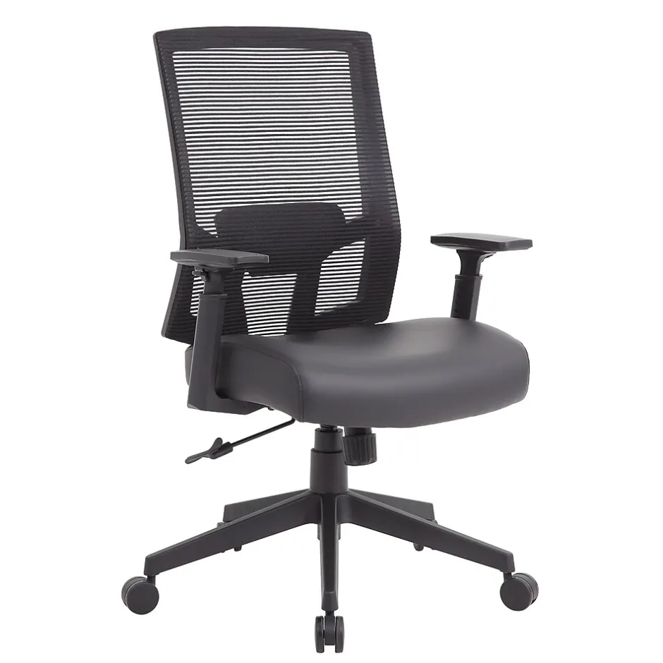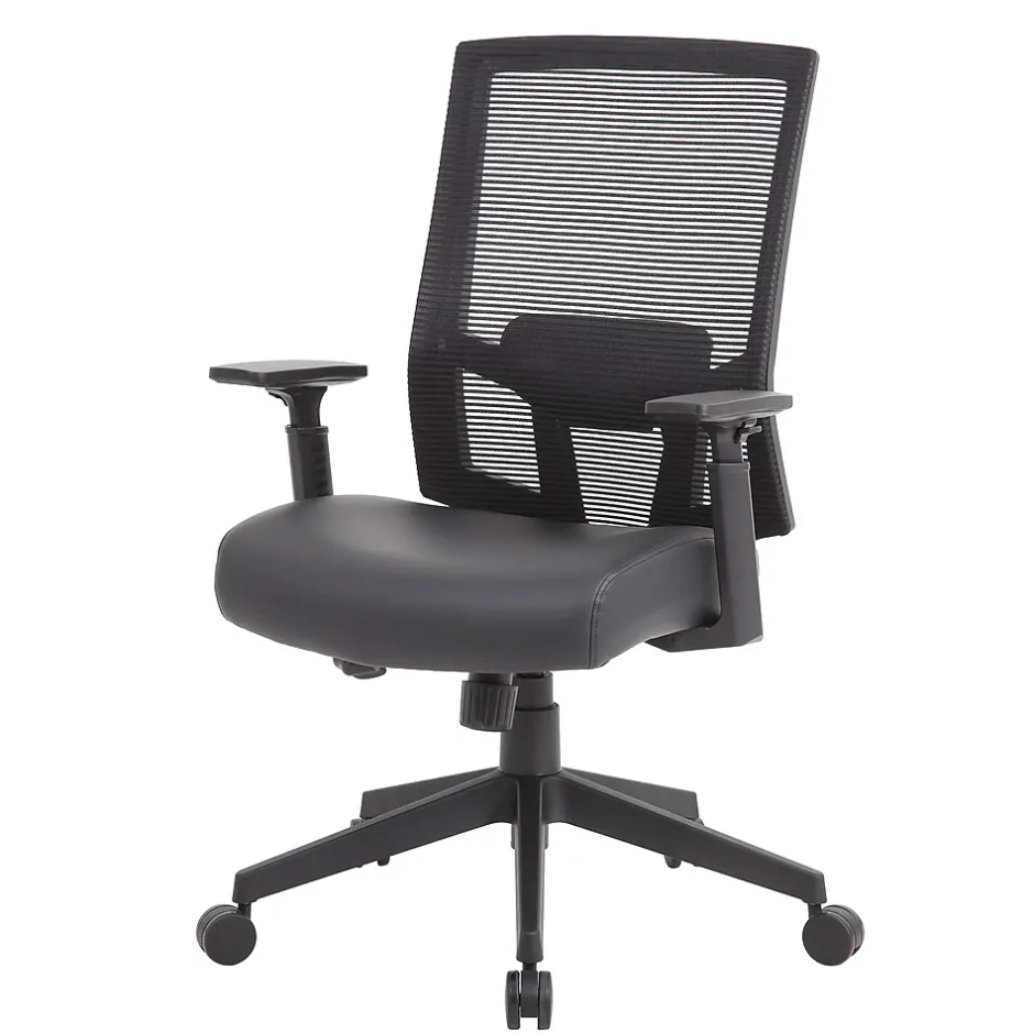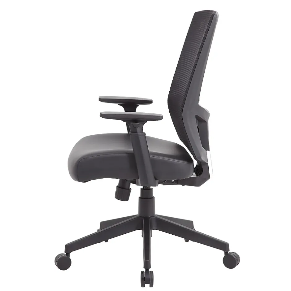 The Boss breathable mesh back task chair is designed with comfort and ease in mind. The seat cushion is upholstered in durable and cleanable antimicrobial vinyl to prevent bacterial growth on the chair’s seat. The chair features a 2:1 synchro-tilt mechanism for added comfort. This allows the backrest and seat to tilt in unison, and the included tilt tension knob allows you to adjust the tilt tension for optimal support. The chair also features height-adjustable arms, a pneumatic gas lift that allows for easily adjustable height, and a maximum weight capacity of 275 lbs. Also boasts a 27″ nylon base and 2″ hooded double-wheel casters.