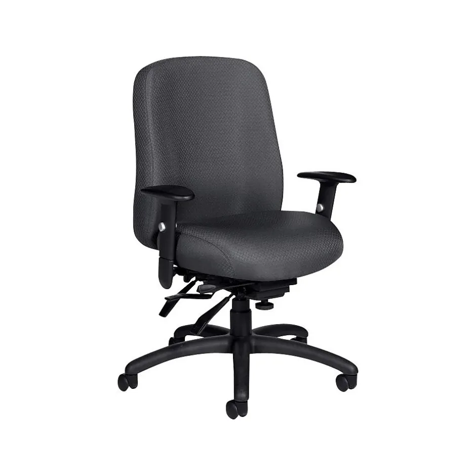 Multi-function task chair with fabric upholstery.