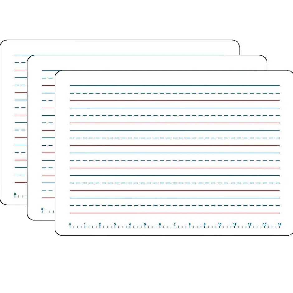 Primary Handwriting Board in Dry Erase for practice, practice, practice. 11″ x 16″ boards are ruled with 6 sets of 1″ lines featuring top lines and broken midlines in blue and baselines in red. Ruler along bottom edge measures items up to 14″. Bright white dry erase surface with hardboard backing and rounded corners for safety. Made in USA. Sold as a pack of 3 boards.