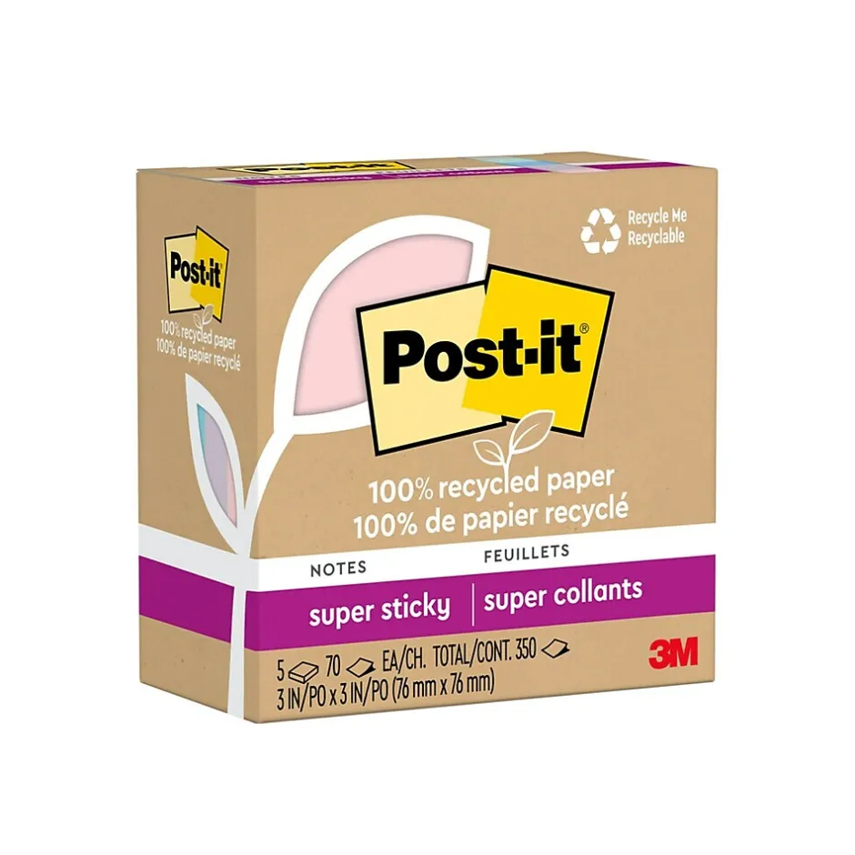 - GET ORGANIZED: Each pack includes 5 pads of 3 in. x 3 in. notes, with 70 sheets per pad, great for your office, work area, or classroom, these Post-it 100% Recycled Paper Super Sticky Notes are a 2024 Good Housekeeping Sustainable Innovation Awards Winner