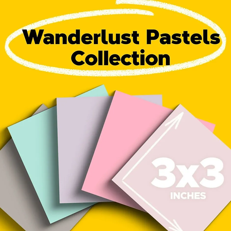 Explore the dreamy vibes from the Wanderlust Collection Post-it Super Sticky Notes, made with 100% Recycled Paper. Whether jotting down your daily to-do’s, brainstorming big ideas, studying or setting reminders, colors and ideas are always brighter together. These sticky notes feature 2X the sticking power. They also stick and re-stick — allowing you to move your notes with you throughout your day. They’re ideal for walls, doors, windows and other vertical surfaces, and like all Post-it Notes, they stick securely yet remove cleanly without damage. Keep your ideas across your notebooks, classroom books, calendars or other documents. No tape or tacks are needed with the water-based adhesive on these notes, saving you money and time on office products or school supplies. A great memo pad, these are ideal for using for notes or reminders to yourself or others. Post-it Super Sticky Notes are the perfect solution for shopping lists, reminders, notes on computer screens, time tracking, to-do lists, marking cables, color-coding documents, reminding kids to do chores, storyboarding, scratch paper and agile processing. Each notes sheet is approximately 3 in. x 3 in., with 70 sheets per pad and 5 sticky note pads per pack. These sticky notes are the Wanderlust Collection including Washed Denim, Fresh Mint, Orchid Frost, Pebble Gray, and Pink Salt. Post-it 100% Recycled Paper Super Sticky Notes and their packaging are 100% curbside recyclable.