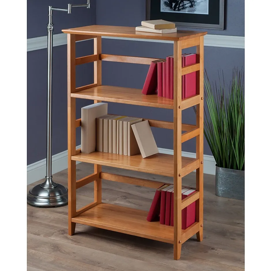 Winsome Studio 3-tier bookshelf in charming honey finish has ample space to accommodate any stationeries.Bookshelf in sleek design has hard-wearing wooden construction and requires assembly.