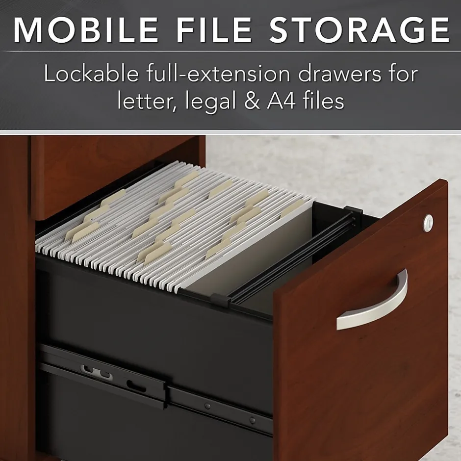 - Mobile file cabinet locks to secure your letter,- legal-, and A4-size paperwork with a file drawer gliding on smooth, full-extension ball bearing slides